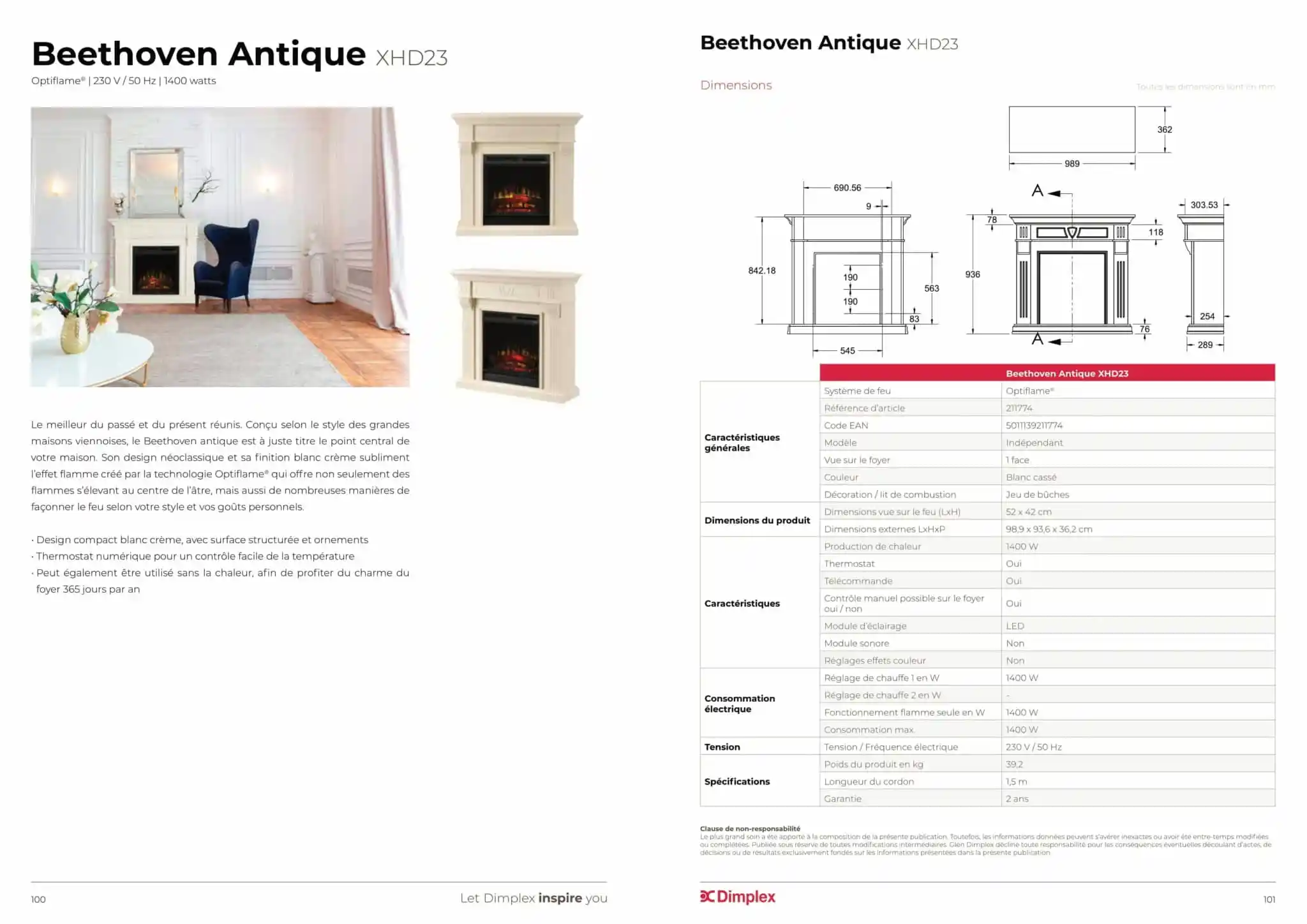 Avec ses dimensions généreuses (98,9 cm de longueur, 93,6 cm de hauteur et 36,2 cm de profondeur), la cheminée Beethoven Antique devient l’élément central de votre pièce, s’inspirant des codes des cheminées classiques Viennoises avec ses moulures et ses effets de colonnes. Simple d’utilisation, il suffit de la brancher pour réchauffer l’ambiance. De plus, la télécommande incluse vous permet de moduler le rendu de la flamme, l’ambiance lumineuse de l’insert et la luminosité de ce dernier.
