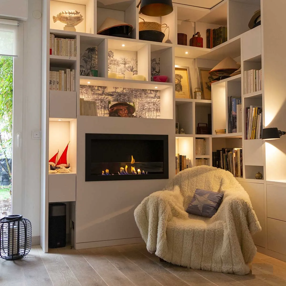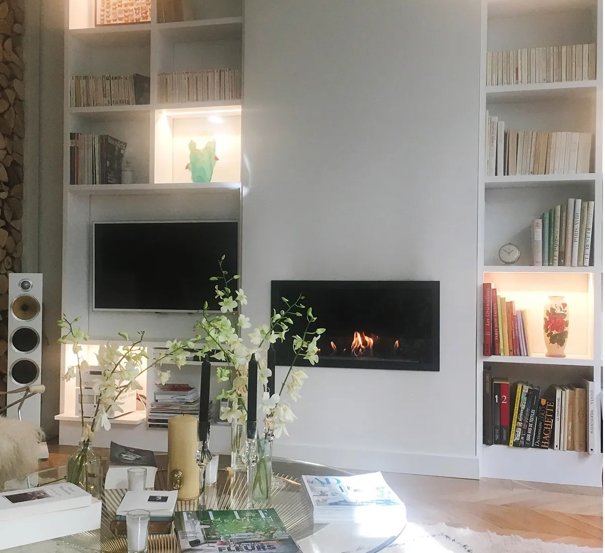 Le foyer éthanol INSERT HF 1-700 offre plusieurs possibilités pour mettre en valeur votre décoration. Vous pouvez opter pour un coffrage sobre et épuré de couleur claire (blanc ou gris perle) qui fera ressortir le noir de votre cheminée éthanol. Pour une décoration industrielle, un coffrage habillé en parement ou en effet béton sera idéal. Vous pouvez également choisir de l’intégrer dans une bibliothèque ou un mobilier sobre et épuré, en bois ou en laquage blanc, pour gagner de l’espace et du rangement dans votre intérieur.